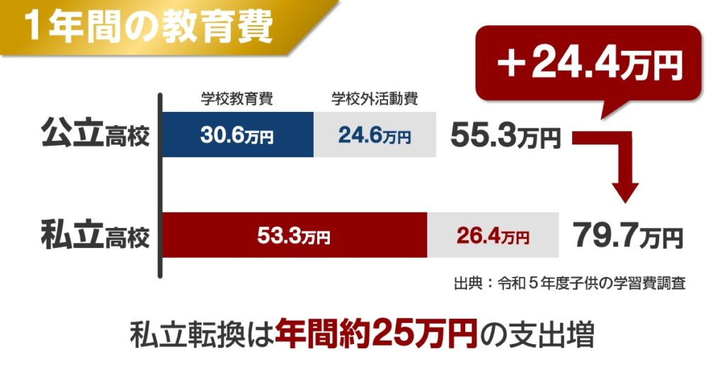 つまり、公立から私立に志向を転換した家庭には年間平均25万円の追加支出が生じているということ。